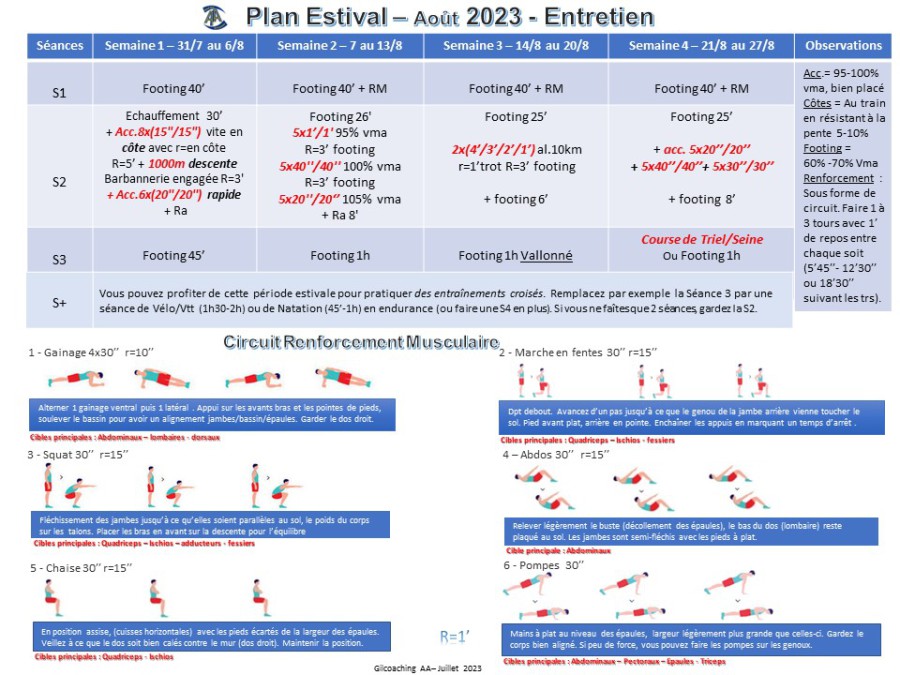 Petite mise à jour de l'agenda club en cours. A noter sur vos calendriers le Test Vma qui se déroulera le mercredi 1er et jeudi 2 octobre. L'Assemblée Générale est prévue le jeudi 9 octobre (pas d'entrainement ce jour-là). En ligne les prochaines séances club pour la quinzaine à venir et également la suite du plan pour le marathon de la Baule avec la phase dite spécifique. Si vous voulez participer à la prochaine course club, les Foulées Achéroises du 28/9, rapprochez-vous rapidement auprès de Thierry. Bonne course à tous pour les AA engagés demain. Gilles