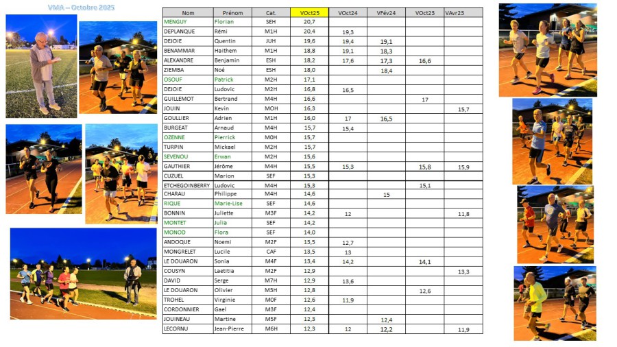 Belle affluence pour le Test Vma de la rentrée disputé mercredi et jeudi soir. Sous le sifflet d’André, 46 athlètes de l’AA se sont élancés sur la piste du stade Diagana. De belles progressions et de nombreuses confirmations pour beaucoup d’entre vous. La pole position pour Marion. avec 15.3km/h et Florian qui établit la meilleure marque AA historique avec 20.7km/h. Bravo à tous et merci à André. Les chasubles sont prêtes pour mercredi prochain. Les résultats